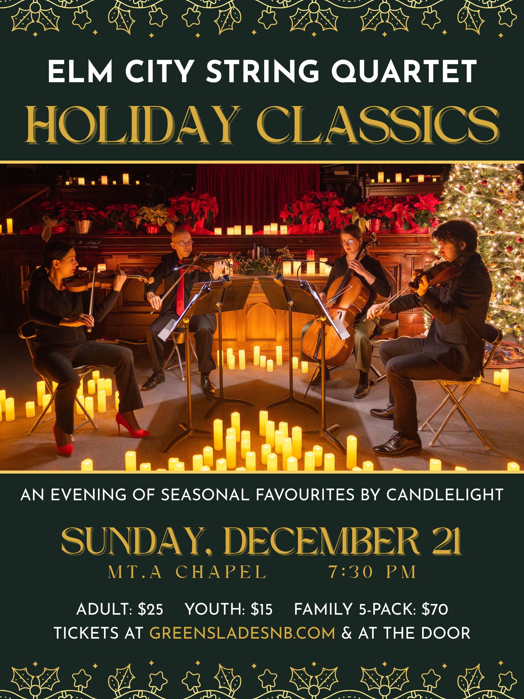 Join Fredericton's acclaimed Elm City String Quartet as they play holiday classics and seasonal favourites by candlelight. Perfect for the whole family. In the spirit of the season, a portion of every ticket sold will be donated to a local charity.