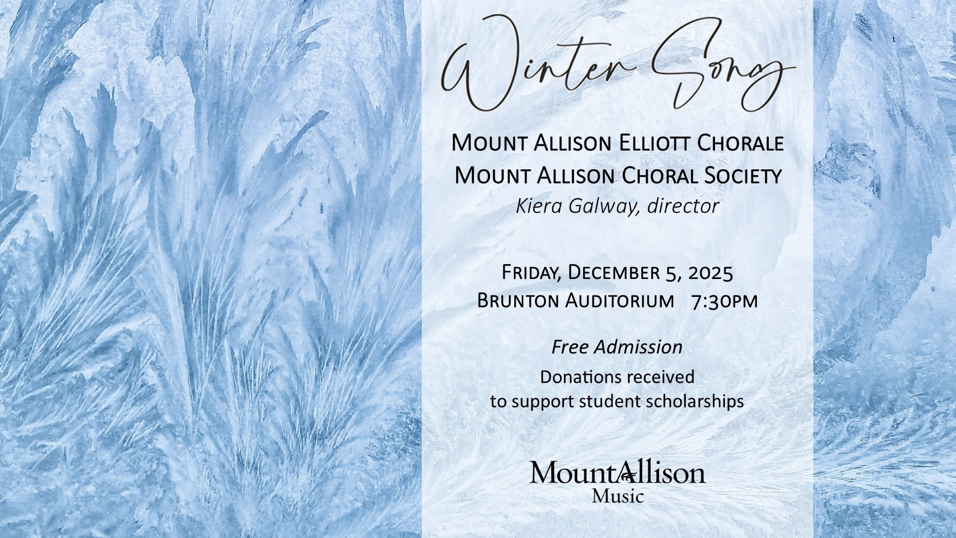 The Mount Allison Elliott Chorale and Choral Society, directed by Dr. Kiera Galway, will perform a program of seasonal choral works. Admission is free; donations will be received at the door, with proceeds for student scholarships and awards. For information call 506-364-2374 or email music@mta.ca.