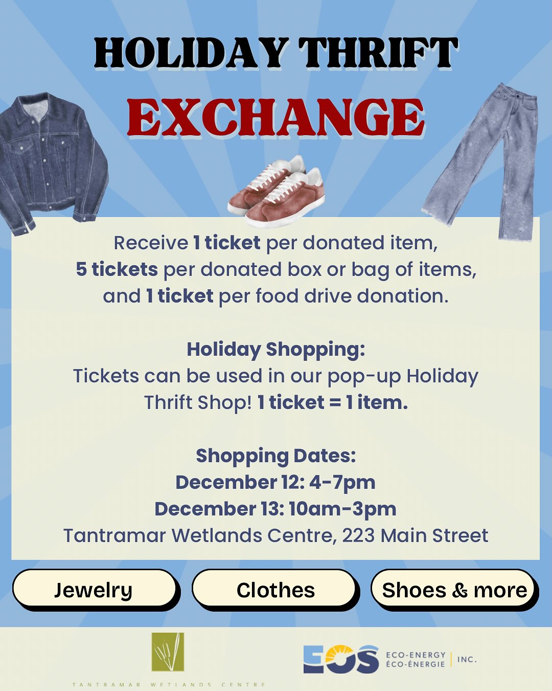 Everyone is welcome to participate in this Holiday Thrift Exchange, brought to you by the Tantramar Wetlands Centre and EOS Eco-Energy! To participate, bring your donation(s) of clothing, jewelry, small kitchenware, and more to the Tantramar Wetlands Centre to receive tickets for taking home items (1 ticket = 1 item) on December 12th and 13th. Donations can be dropped off at the Tantramar Wetlands Centre on Mondays-Fridays between 9am and 3pm. The Tantramar Wetlands Centre is located within Tantramar Regional High School, at 223 Main St., Sackville.