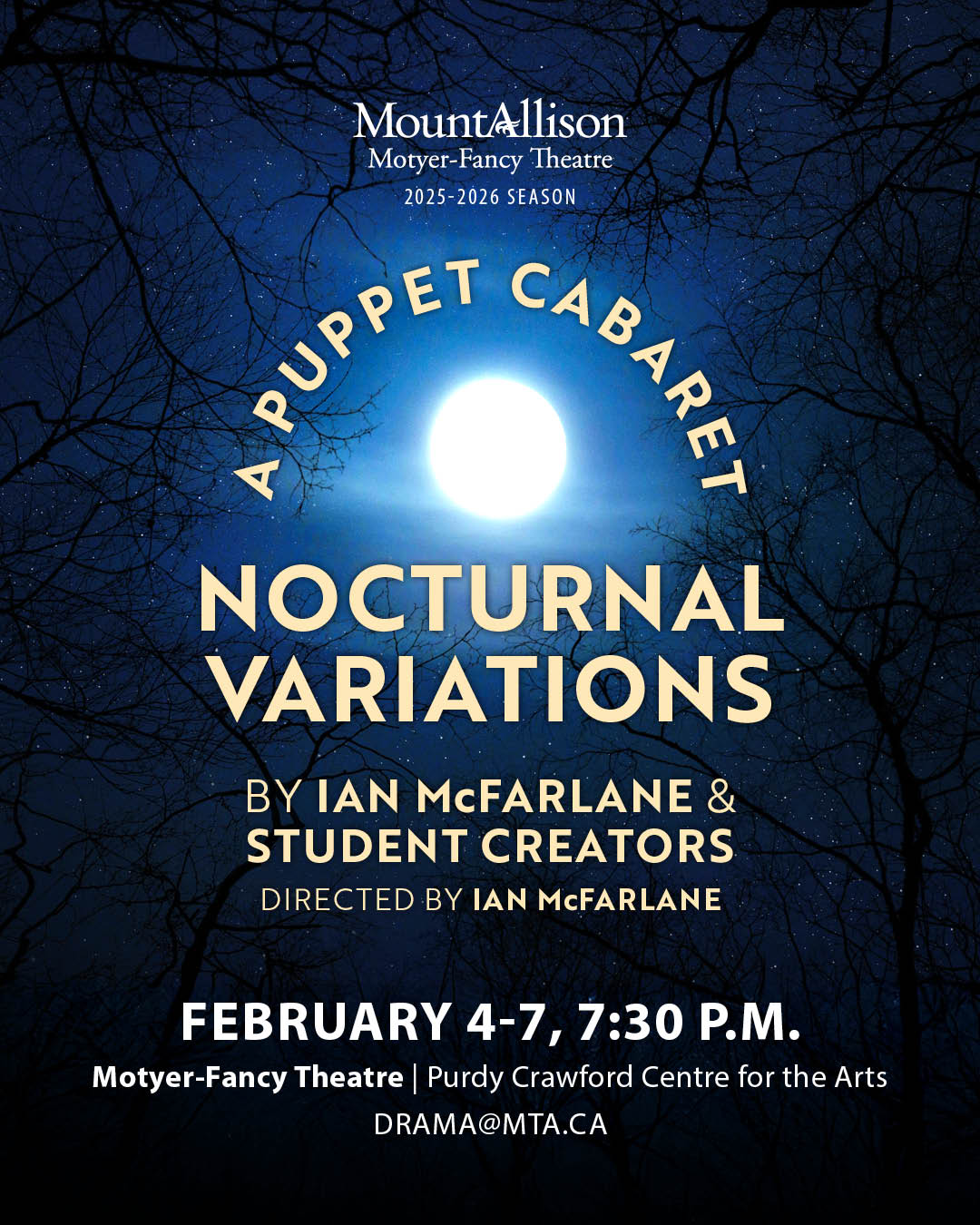 An endless night filled with sleepless dreams opens a floodgate to visions of joy, grief, and transformation. Welcome to Nocturnal Variations, the cabaret where consciousness is relative and the performances are more-than-human. Featuring original puppet acts created by Mount Allison students, this design-led, devised theatre creation addresses the precarity of our current moment through humour, grace, and absurdity. Suggested audience 14+.