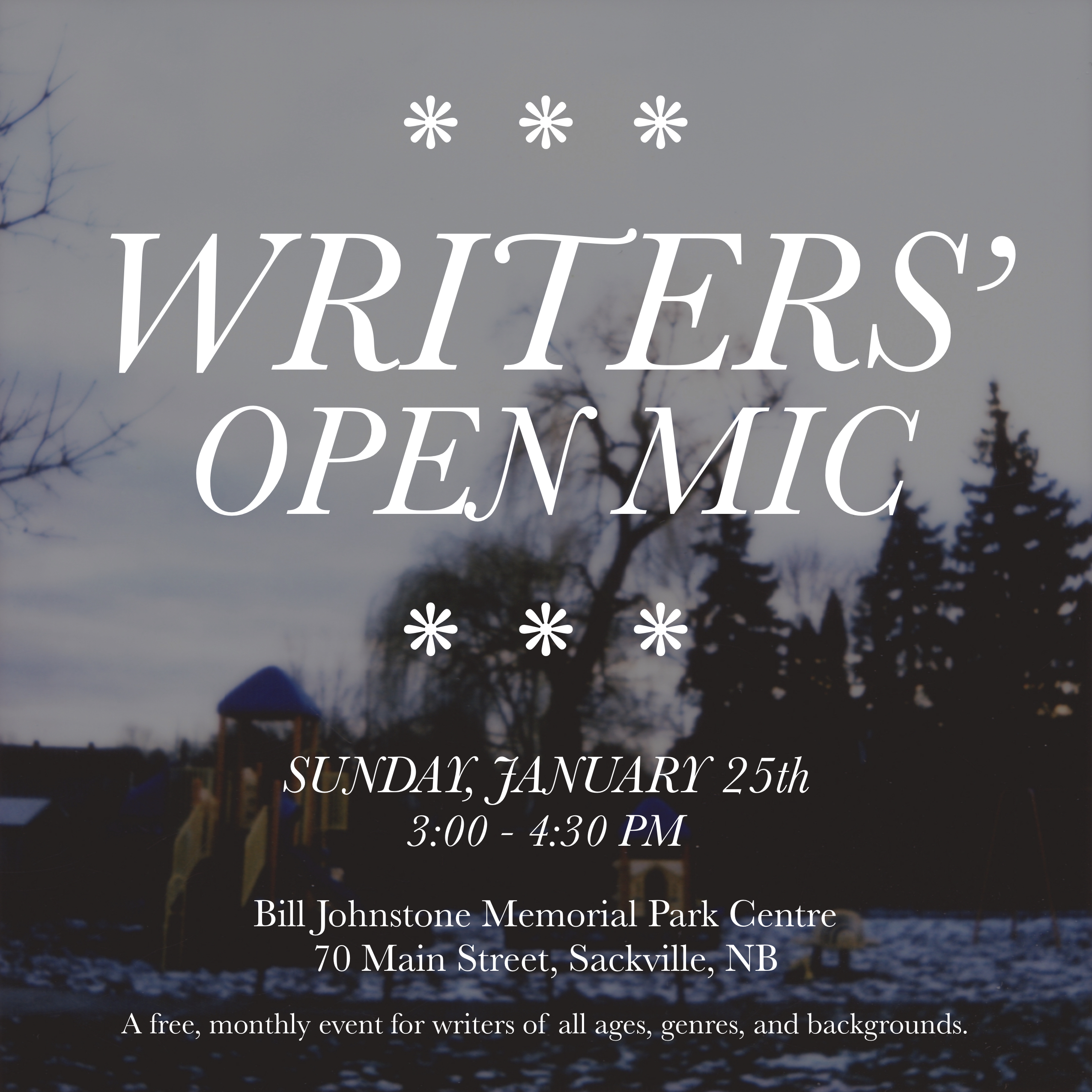 The Writers’ Open Mic is a free monthly event open to all. Come out and read your poems, songs, short stories, comics, novels, essays, stand-up comedy, etc. Or just come to listen. Please note that there will not be a projector at this month's event. Accessibility concerns and general questions can be directed to laurawatsonartwork@gmail.com. Follow the Writers’ Open Mic on Instagram at @writersopenmic for updates.