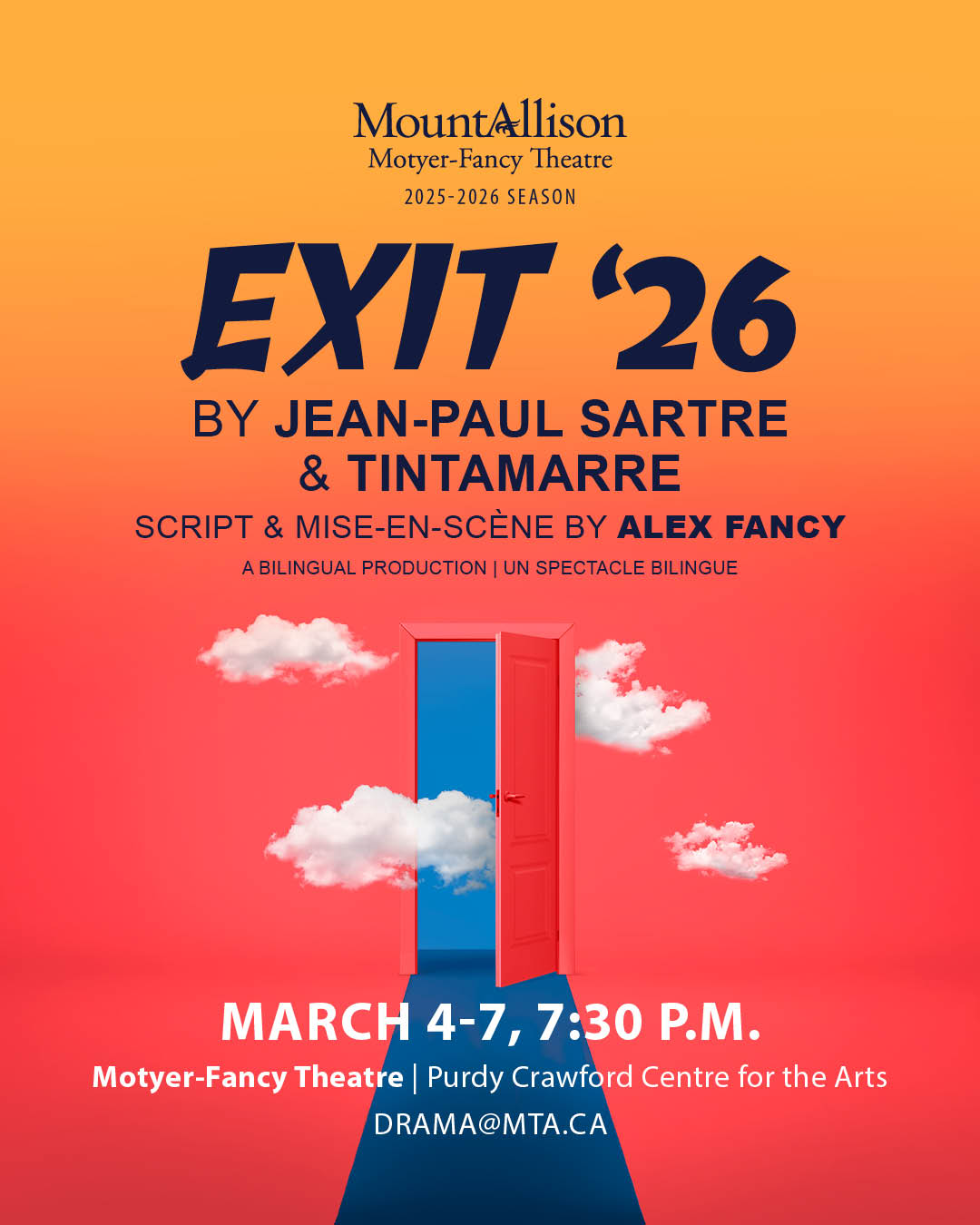 EXIT ’26, a bilingual Tintamarre comedy Galeck and his actors are rehearsing a script they chose for 2026: Jean-Paul Sartre’s iconic Huis-clos / No Exit. Three very incompatible people are in Hell for cowardice and capitulation in the face of autocracy. All goes well until characters from other plays invade the stage, question the choice of script and raise their own hell. Who knew the Moitié-Fantasy Theatre was haunted? But all’s well that ends well, especially if the outcome is joyous and inspiring. Vive le théâtre!